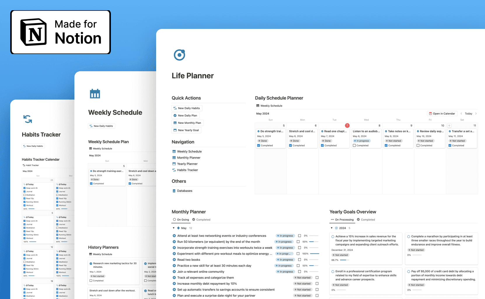 Plan and organize all aspects of your life with this comprehensive template. It covers areas like personal, professional, and health goals.