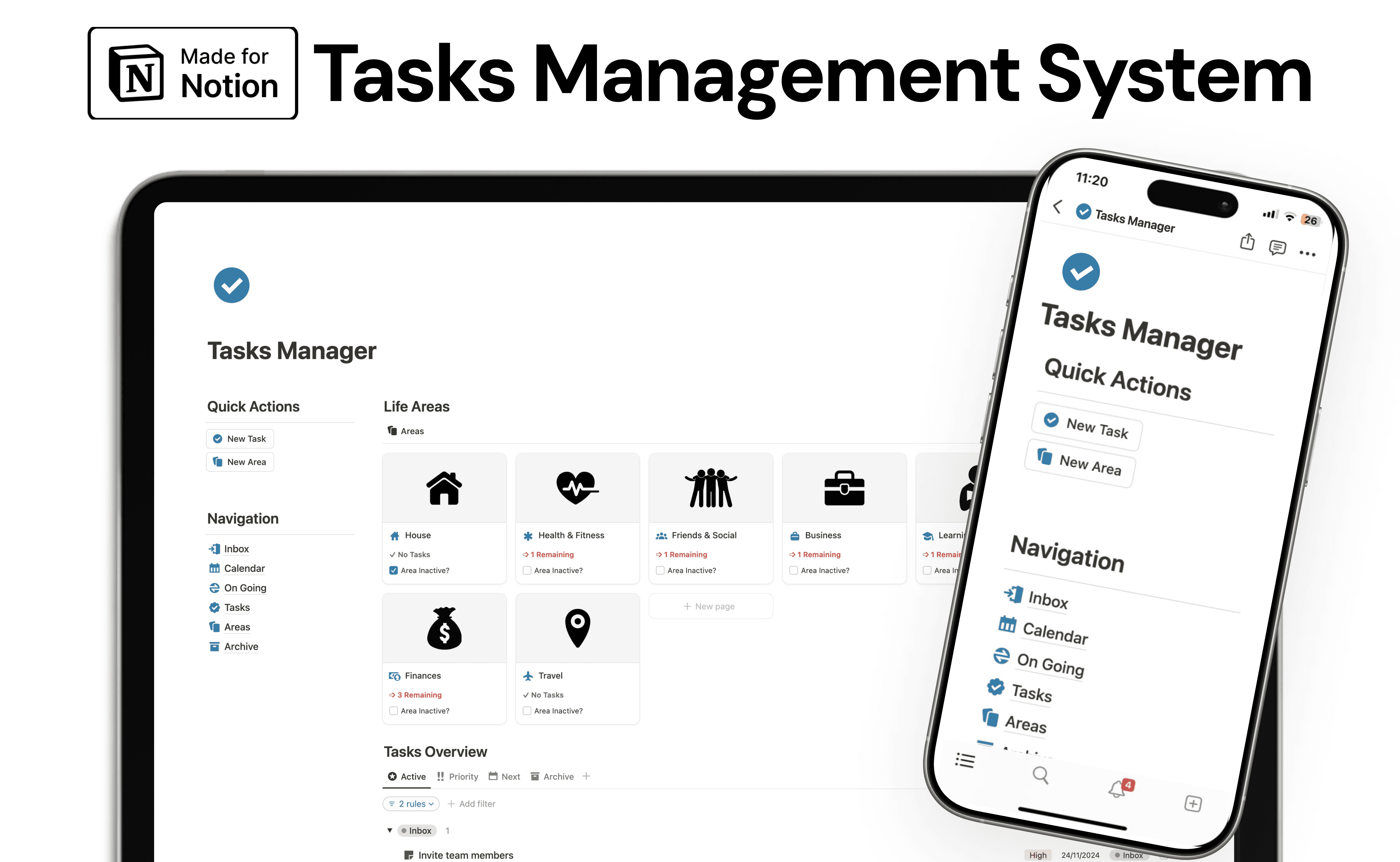 Implement the renowned GTD methodology with this template. It helps you capture, process, organize, review, and do your tasks effectively.