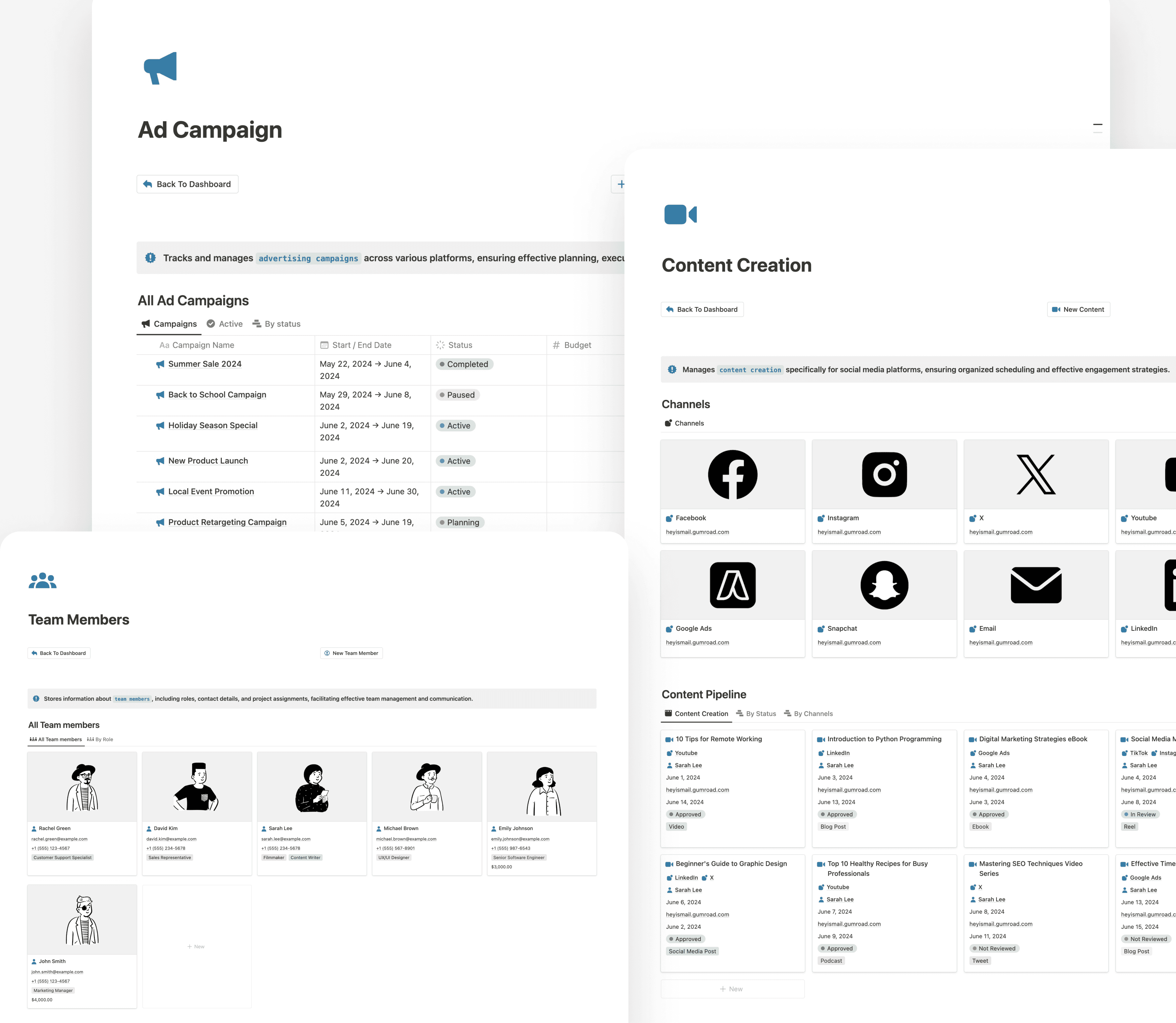 Manage your ad campaigns, create compelling content, and coordinate your team—all from one place. The Marketing & Team Management Hub helps you streamline ad strategy, track content creation, and ensure your team is aligned and on task. Whether launching new campaigns, publishing content, or tracking team progress, this powerful section keeps your marketing efforts and team operations moving forward with precision and ease.