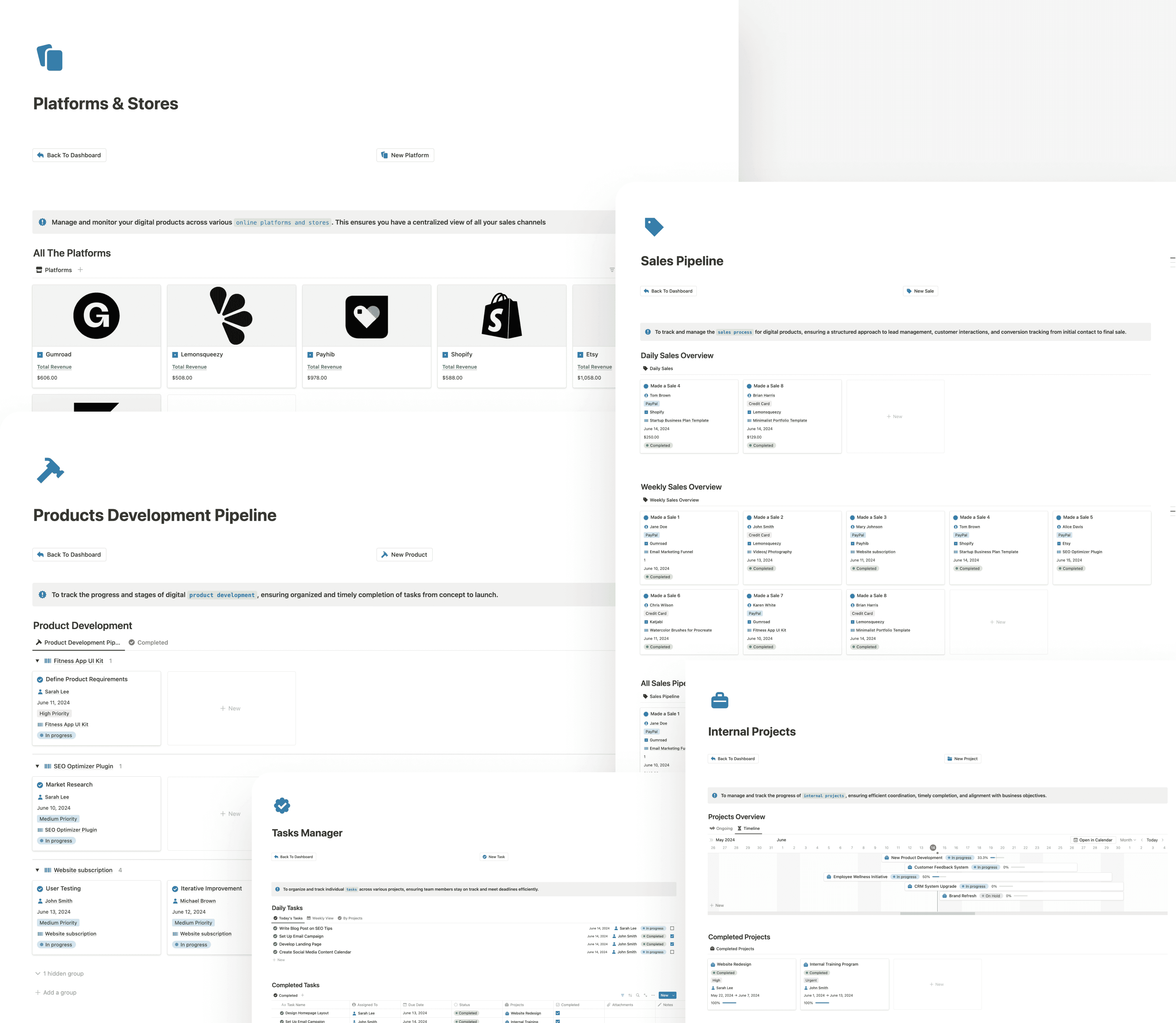 From tracking your sales journey to overseeing product development, managing tasks, and handling internal projects, the All-in-One Business Operations Hub puts everything you need in one place. Streamline your workflow, boost productivity, and drive growth with intuitive views for each critical business area. With this unified system, you’ll stay on top of your sales pipeline, manage your platforms and stores, develop products seamlessly, and ensure your internal projects stay on track—all without the hassle of juggling multiple tools.