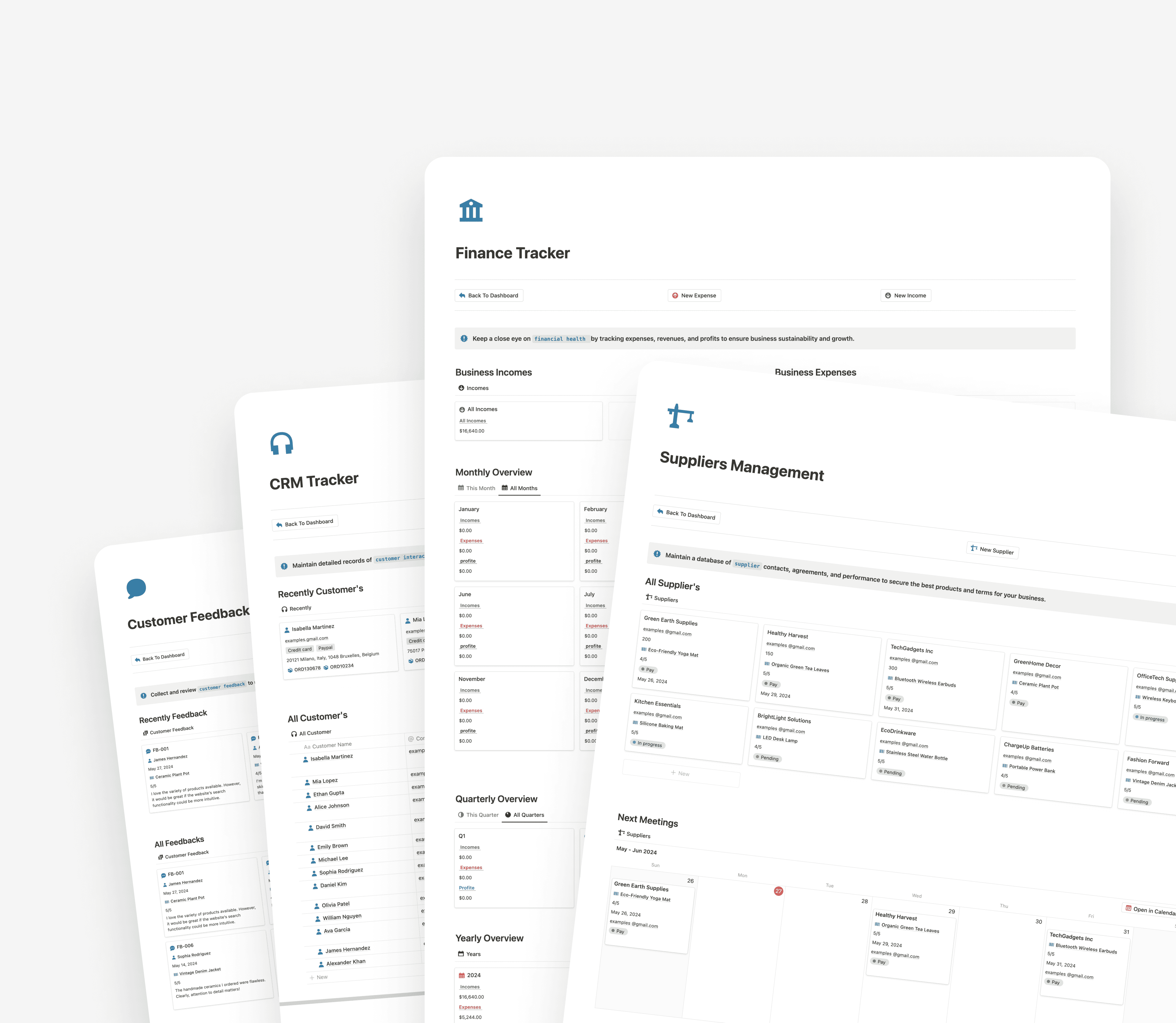 Manage your customer relationships, coordinate with suppliers, track finances, and gather valuable feedback to drive smarter business decisions and build lasting connections.