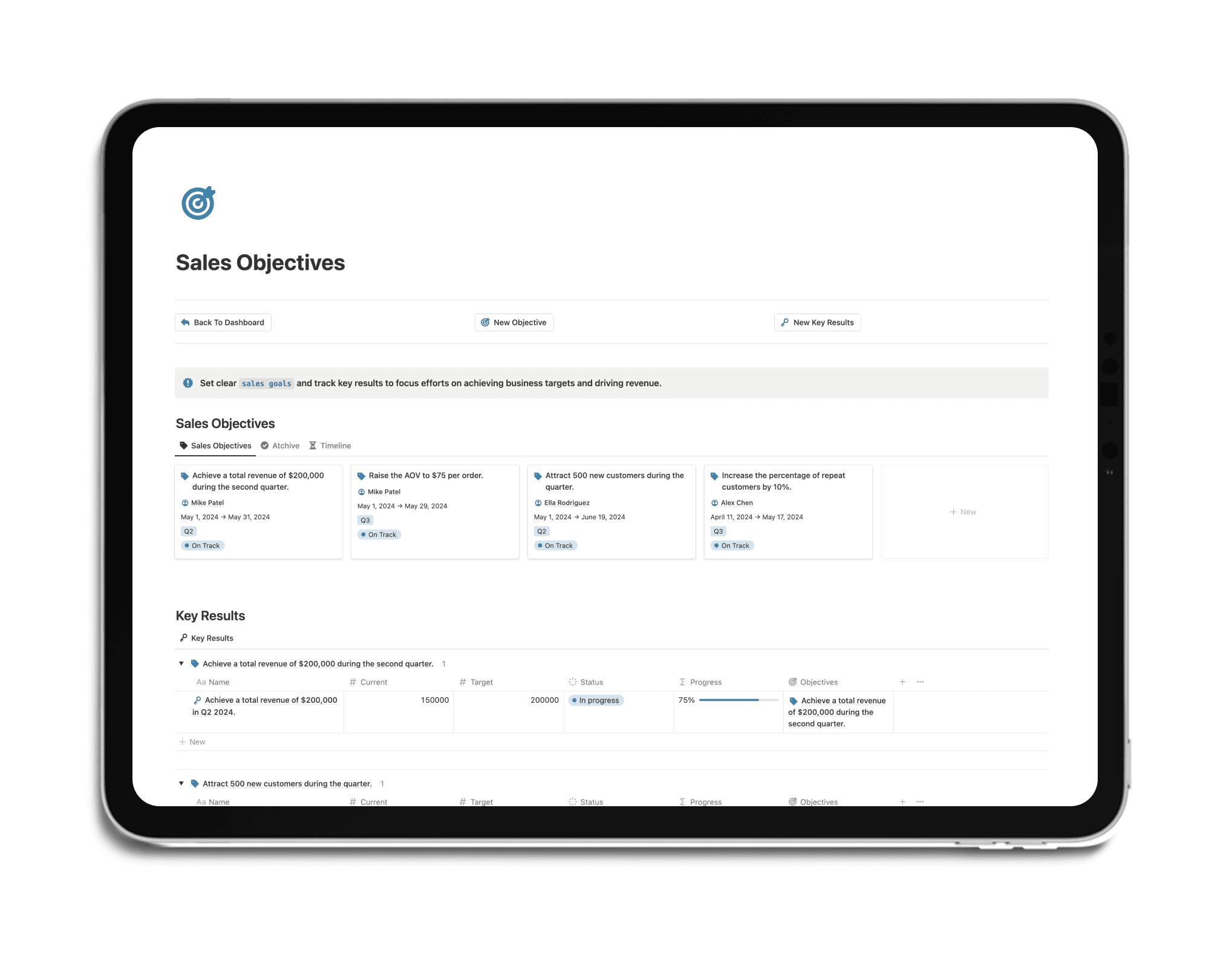 Set ambitious sales objectives and key results, track your progress, and drive your team's performance toward success.