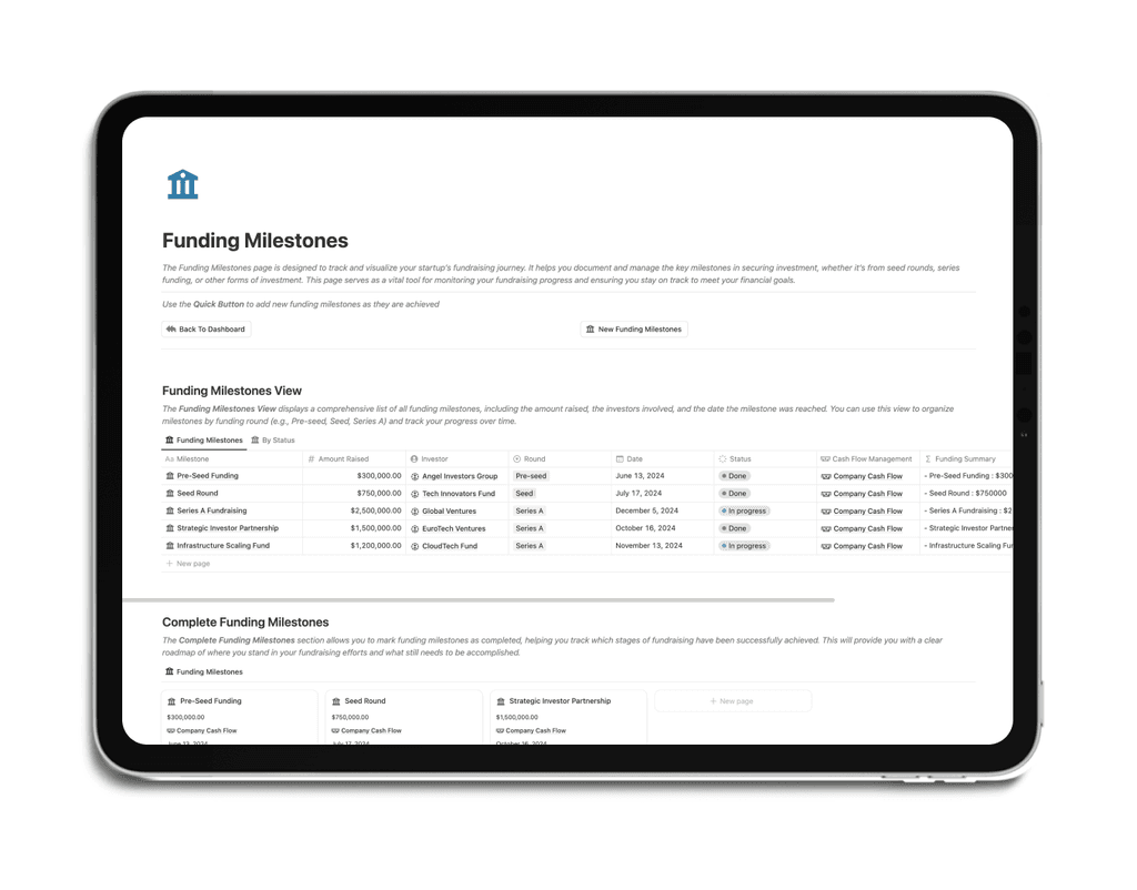 A central hub to access key pages, track tasks, and stay updated on your startup’s progress.